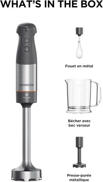 Puissance de 1000W avec deux vitesses, doté du système Triblade, d’une tige XL et d’une poignée SureGrip, livré avec un fouet en métal, un presse-purée métallique et un bécher avec bec verseur.