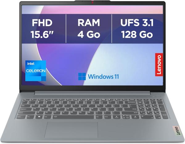PC portable 15,6’’ Full HD équipé d’un processeur Intel Celeron N100, de 4 Go de RAM, de 128 Go de stockage UFS 3.1, de графiques Intel UHD, fonctionnant sous Windows 11 Home en mode S, avec un clavier AZERTY français, le tout dans un design gris.