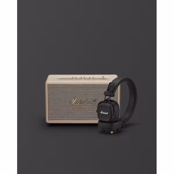 Pack audio comprenant une enceinte Bluetooth Marshall et le casque sans fil Major IV pour profiter d’un son puissant à la maison et en déplacement.