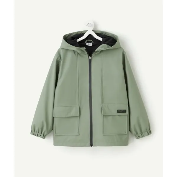 Veste imperméable verte avec capuche, conçue pour protéger efficacement tout en assurant confort et style pour les enfants.