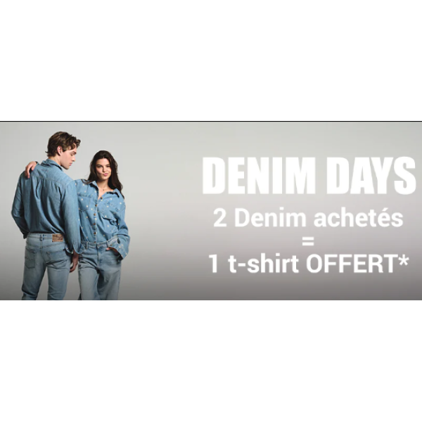 Offre promotionnelle permettant d’obtenir un t-shirt gratuit pour l’achat simultané de deux articles en denim de la nouvelle collection Denim 89.
