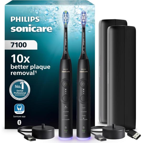 Pack de 2 brosses à dents électriques Philips Sonicare 7100 conçu pour améliorer significativement la santé des gencives et éliminer jusqu'à 10 fois plus de plaque dentaire.